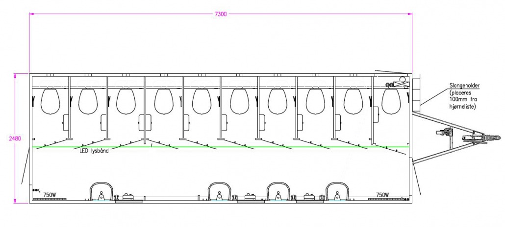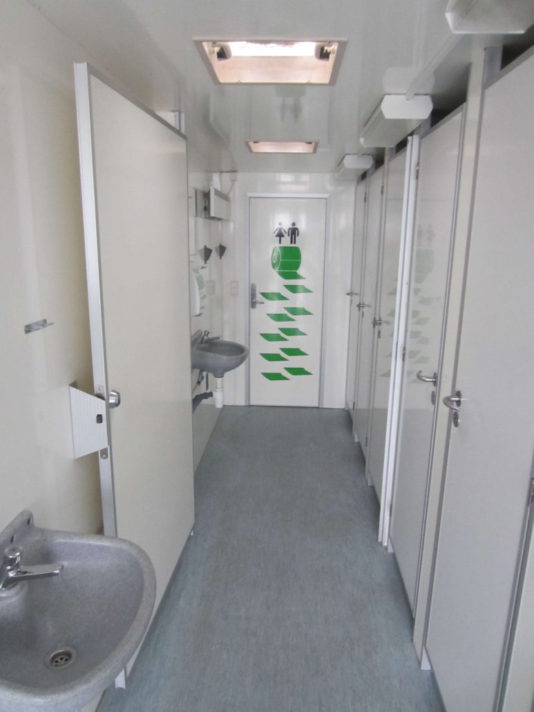 10 toilets, 4 washbasins, 3 hand dryers, mirror, jumbo toilet paper holders, madame bag holder.
